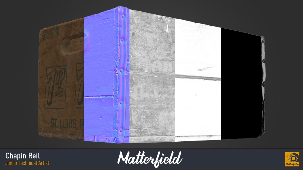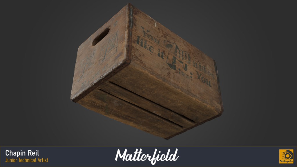 This is an example of the object work I did at Matterfield. This crate was scanned with cross-polarized photogrammetry using a Sony a7riv camera. After I scanned the crate I also processed it to a retopologized quad mesh with a pbr texture set.