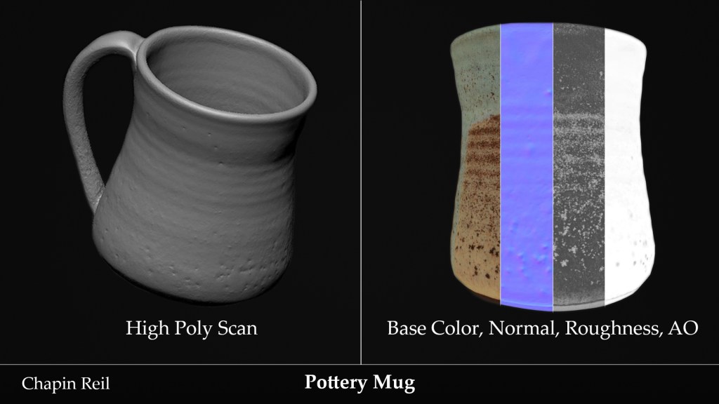 I chose these three items for this project since each offered a different material type to scan and process. Each model was cleaned up in Zbrush before being retopologized to a quad-based model. Once the quad model was complete with UVs, I baked the base color and normal maps before moving to Substance Painter and Designer to process and create the other maps. I used Blender to set up the correct pivots for the objects before importing them into the engine.